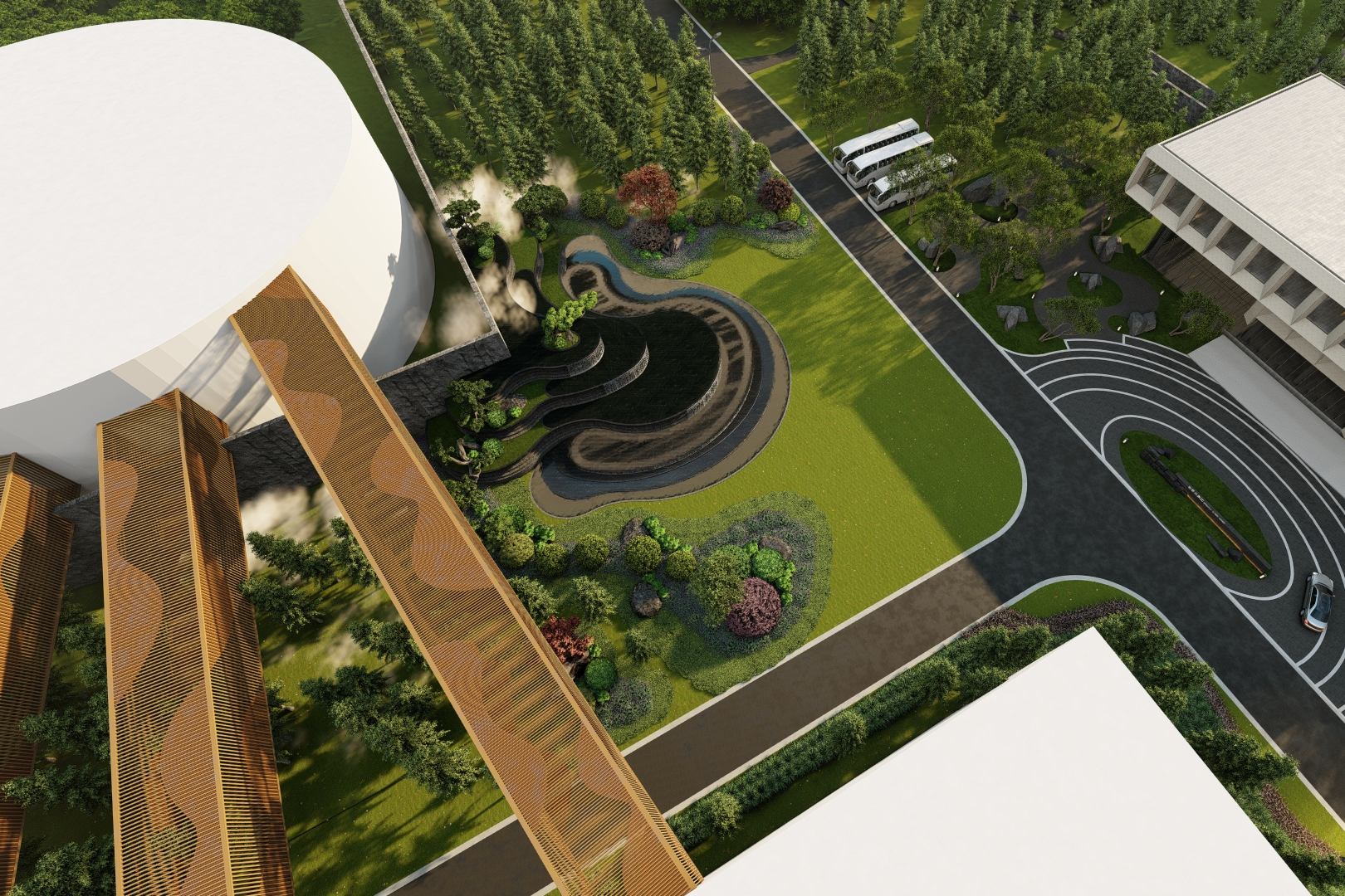 more景觀設計提取酒杯的形態設計成獨具特色的亭子,提供休息、靜讀的場所。在亭子上安裝地...